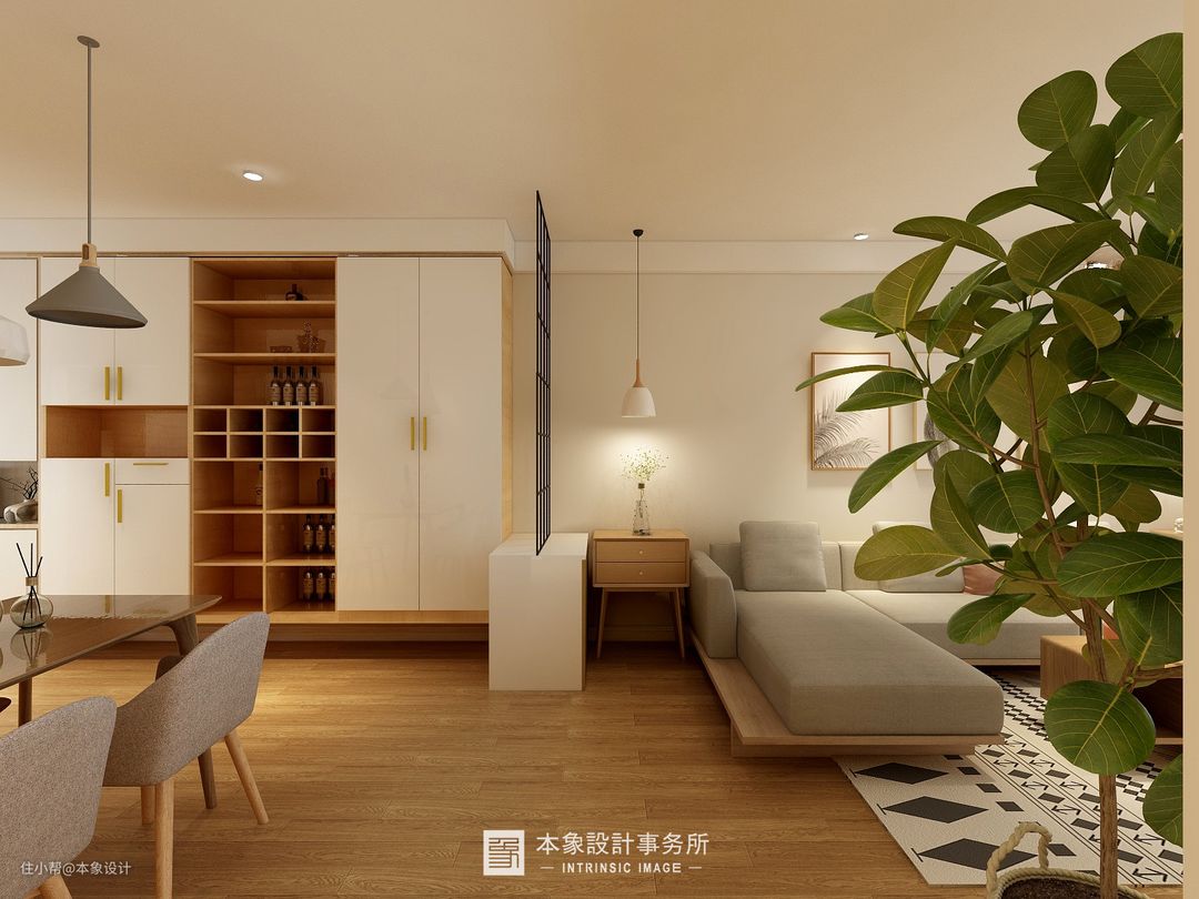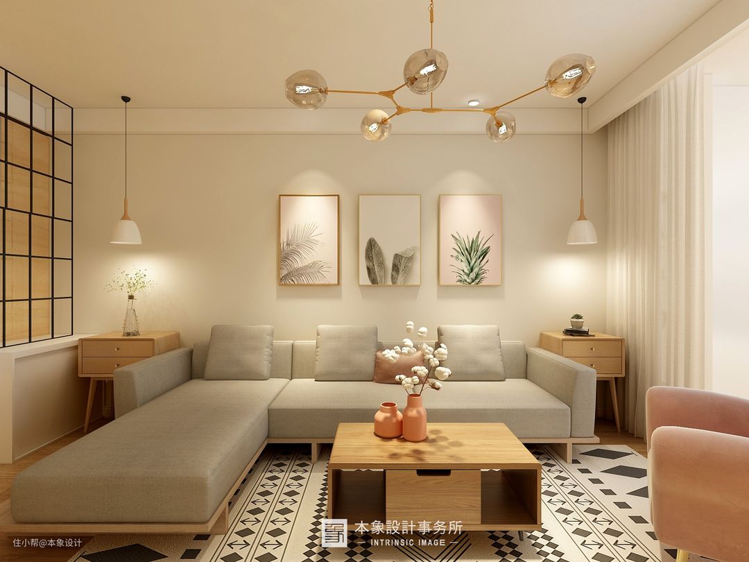 现代北欧清新气息的浅木色和白色撞色搭配结构,家具使用原木色搭配灰色布艺及粉色家具,木纹呈现细腻又具有自然肌理。