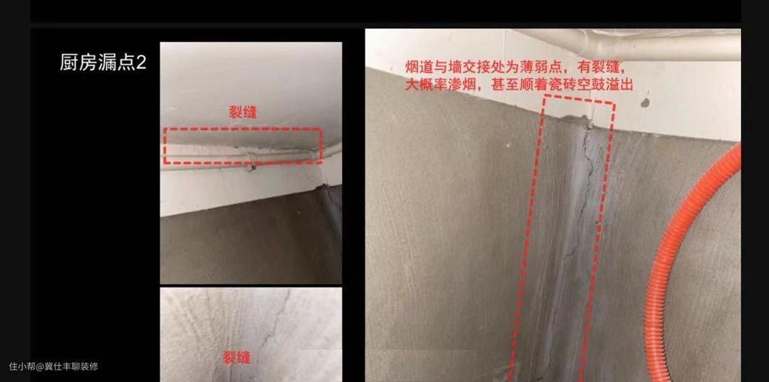 为什么说这个原因很罕见呢?因为烟道破损,最常见的情况就是烟道的外侧开裂,而内侧的墙角和墙面都是原始墙体,稳定性较强,还是极少出现开裂情况的。在实际装修施工过程中,绝大多数装修公司和施工队在施工的时候,也不会或者没有办法把脑袋伸到烟道里进行检查——这就提示了业主:如果在装修前厨房有反味现象,务必要进行检查,哪怕是把烟道开两个洞。