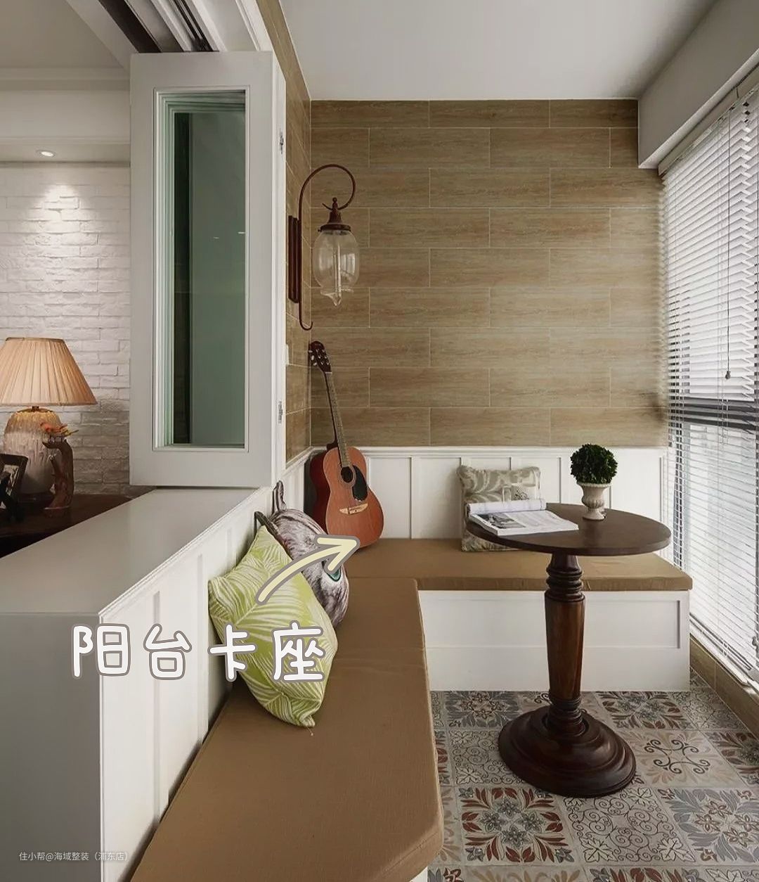 很多人不会想到在阳台设计卡座的,其实在阳台设计卡座不仅仅是方便坐着喝茶聊天聚会,更重要的是家里来客多男士女士各有自己的圈子,各有各说话聊天的地方。在阳台可以坐着、躺着晒晒阳光,也可以增多房屋的储物的空间。