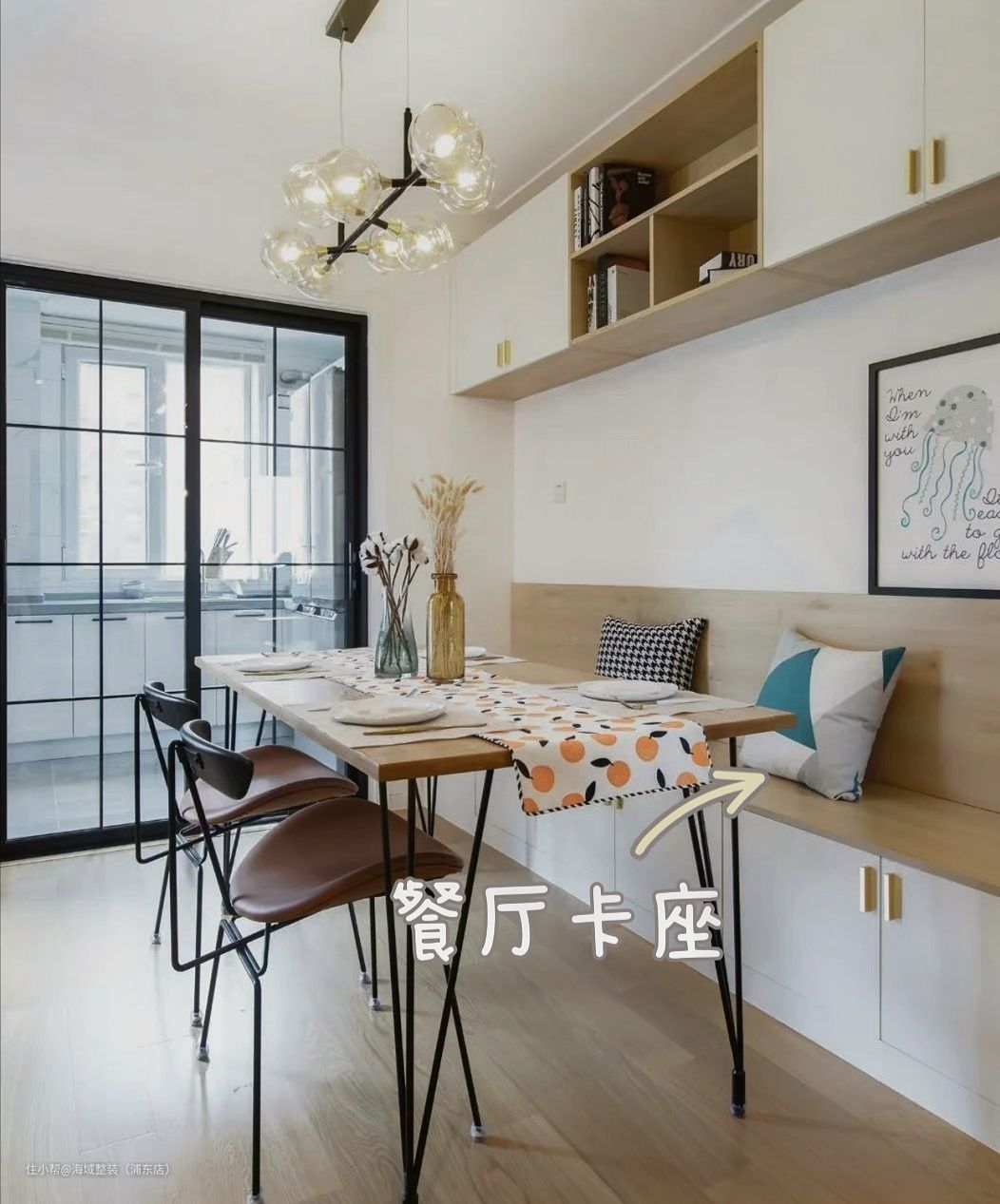 客厅隔出餐厅的位置,如果避免不了与房门相迎,我们可以设计卡座,不仅解决了餐椅的问题,还解决了玄关鞋柜的问题,在卡座下方还可以设计储物空间,在餐厅的位置预留一些插座方便弄火锅的时候不用来回牵线,也可以作为办公、学习的地方。离近厨房的位置一般都是餐厅的位置,家里的人较多,卡座就是一个非常好的设计,不占用空间,合理的将空间利用起来,还可以具备储物的空间,餐椅不用在来回拖动。