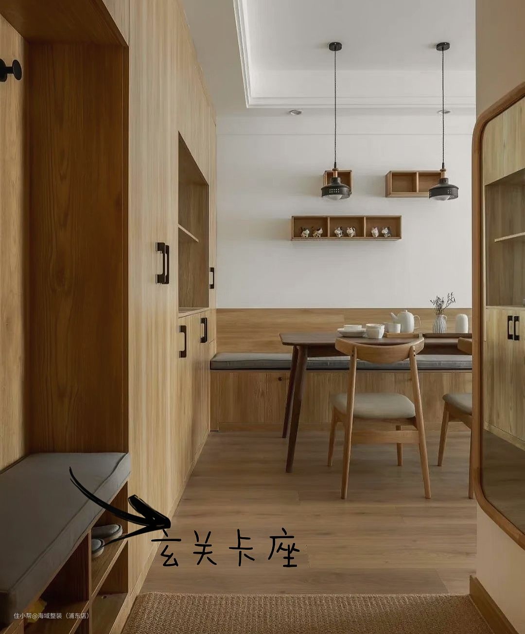 玄关设计卡座节约空间的整体面积,也方便换鞋、放置东西,不会影响整体的设计美感,非常实用的一种设计,不再是单一的那种鞋柜设计。墙体后面可以设计一些洞洞板,挂一些衣物、包包都是可以的。