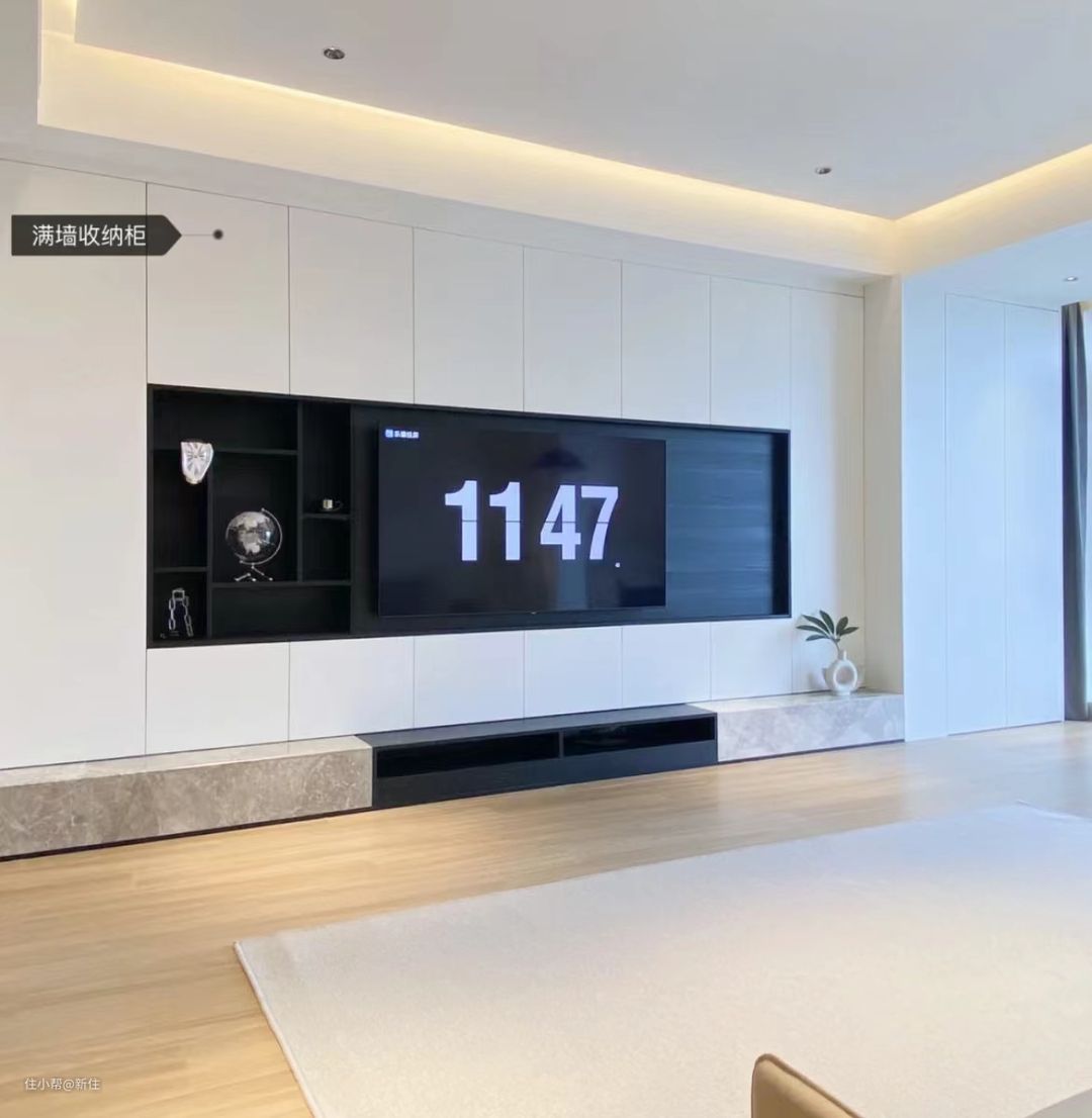 新住建议:电视背景墙做简约的柜子,简约、大气,也能分担家里的收纳空间。