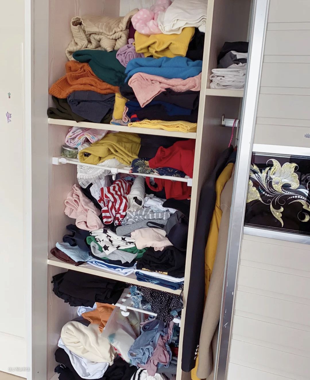 而实际,这样的分类,会增加很多劳动量,一周不整理衣柜就会像下图一样,乱的速度简直让人崩溃,而且这是分隔板衣柜家庭的常态。