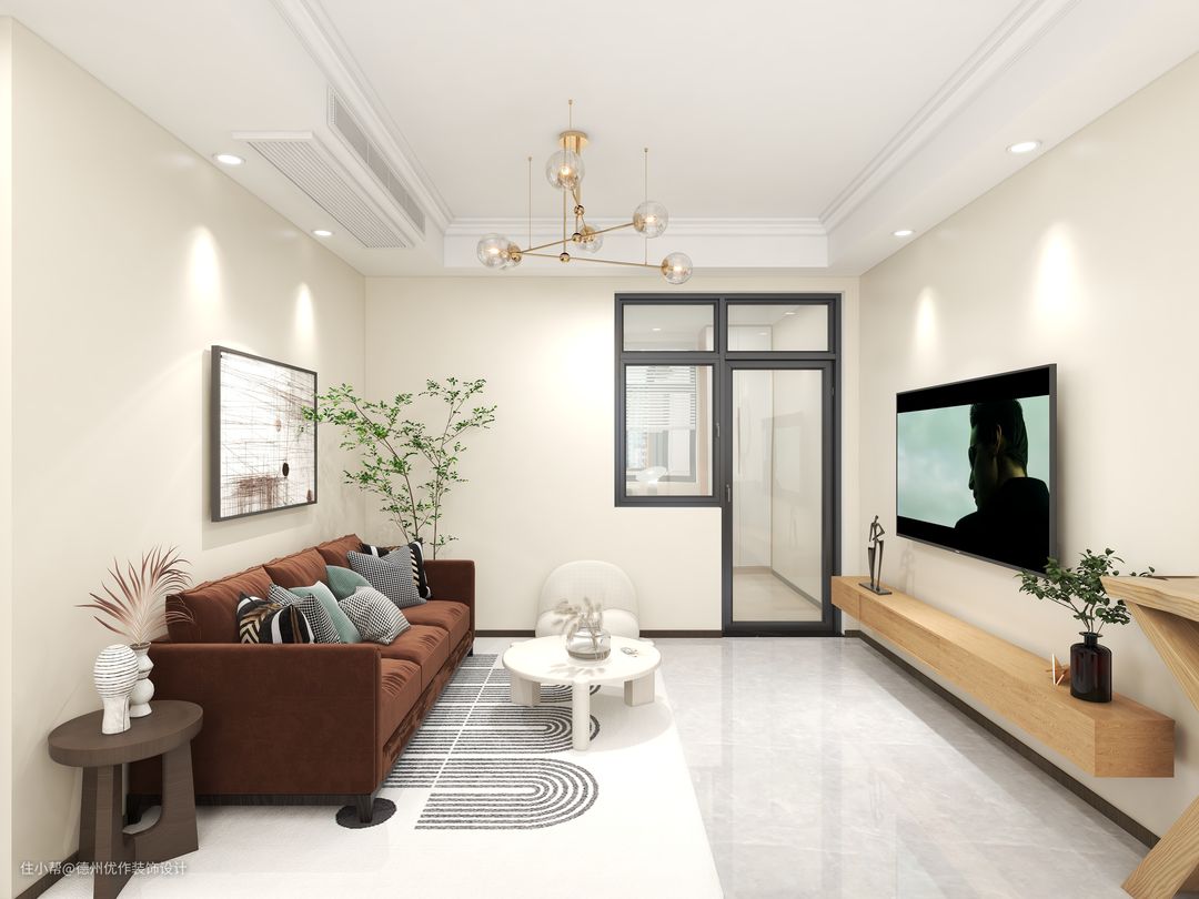本次客餐厅整体空间较小巧,整体乳胶漆颜色以淡奶咖为主,棕色、原木点缀。为保证客餐厅空气流通、采光充足的情况下,儿童房用门窗一体设计,不但保证了空气流通、采光充足,更加方便家人做饭时看管孩子安全学习等。
