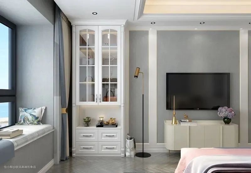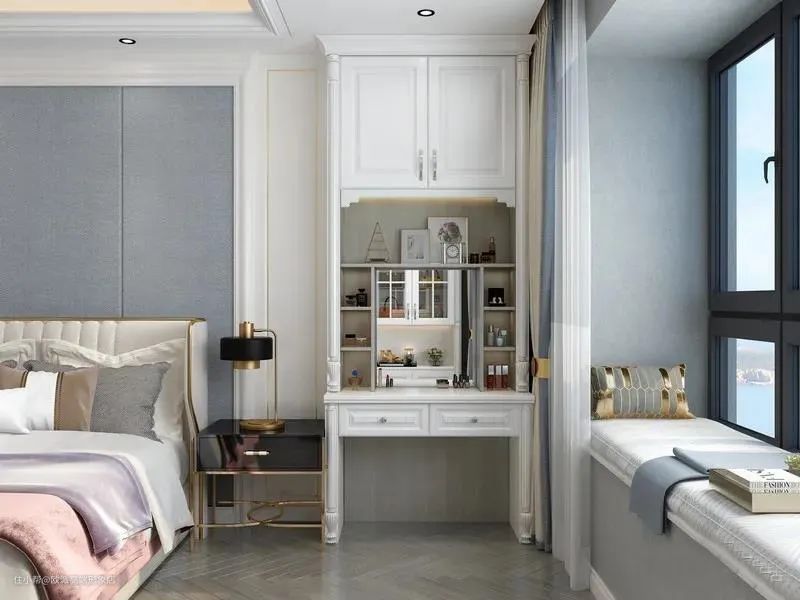 家具和软装在风格上保持一致,都选择了精致优雅的简欧风格。到顶衣柜分为三段式,左右两侧划分男女主人的衣物收纳区域,收纳有致。飘窗两侧的梳妆台组合柜和书柜颜值也很亮眼。