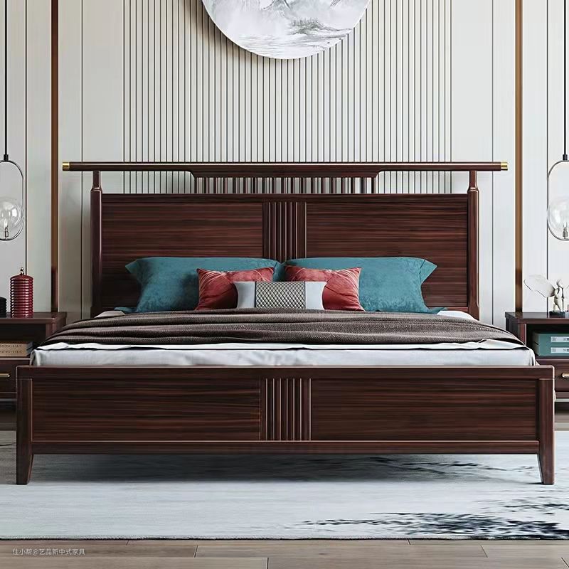 卧室新中式实木家具,采用乌金木,其华美的纹理就像会流动的花纹,拥有狂野浪漫的色彩,灵动优美,新中式保留了中式陈设的美学设计和布局,使家居空间在充满了古典文化气息的同时,又不失现代家具的简约实用。