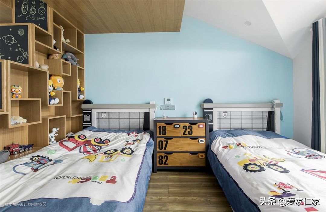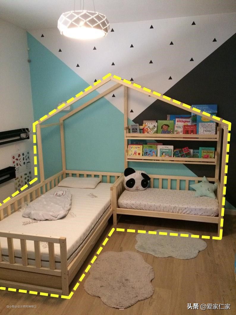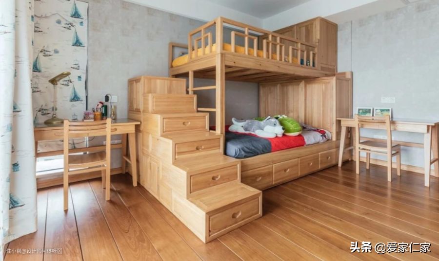 如果你家也有两个孩子,儿童房空间面积又不大的话可以尝试一下这种转角一体双人床,反正小编家里用的就是这个,两个小孩儿住得也非常舒服。