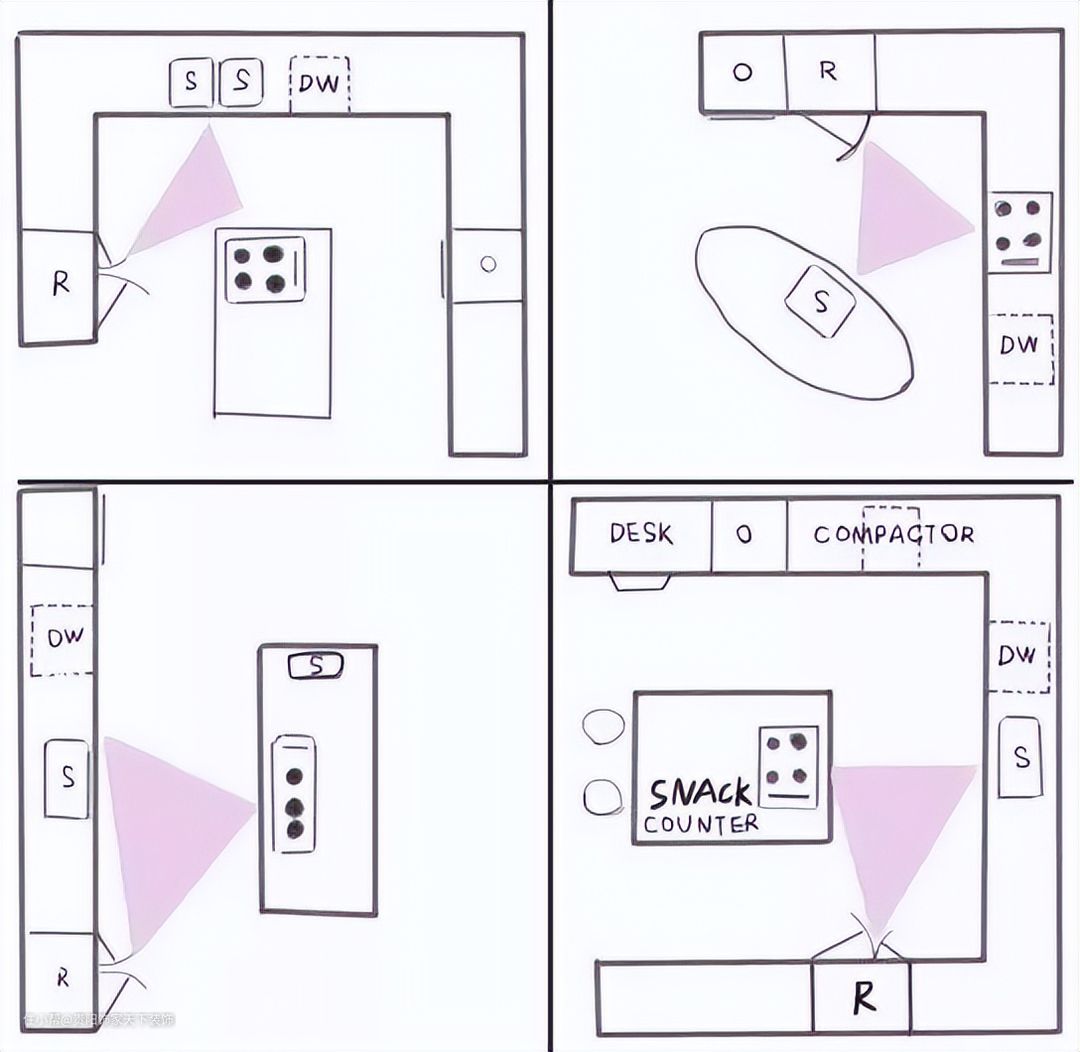 不同厨房适合不同形状、尺寸的岛台(如下图)