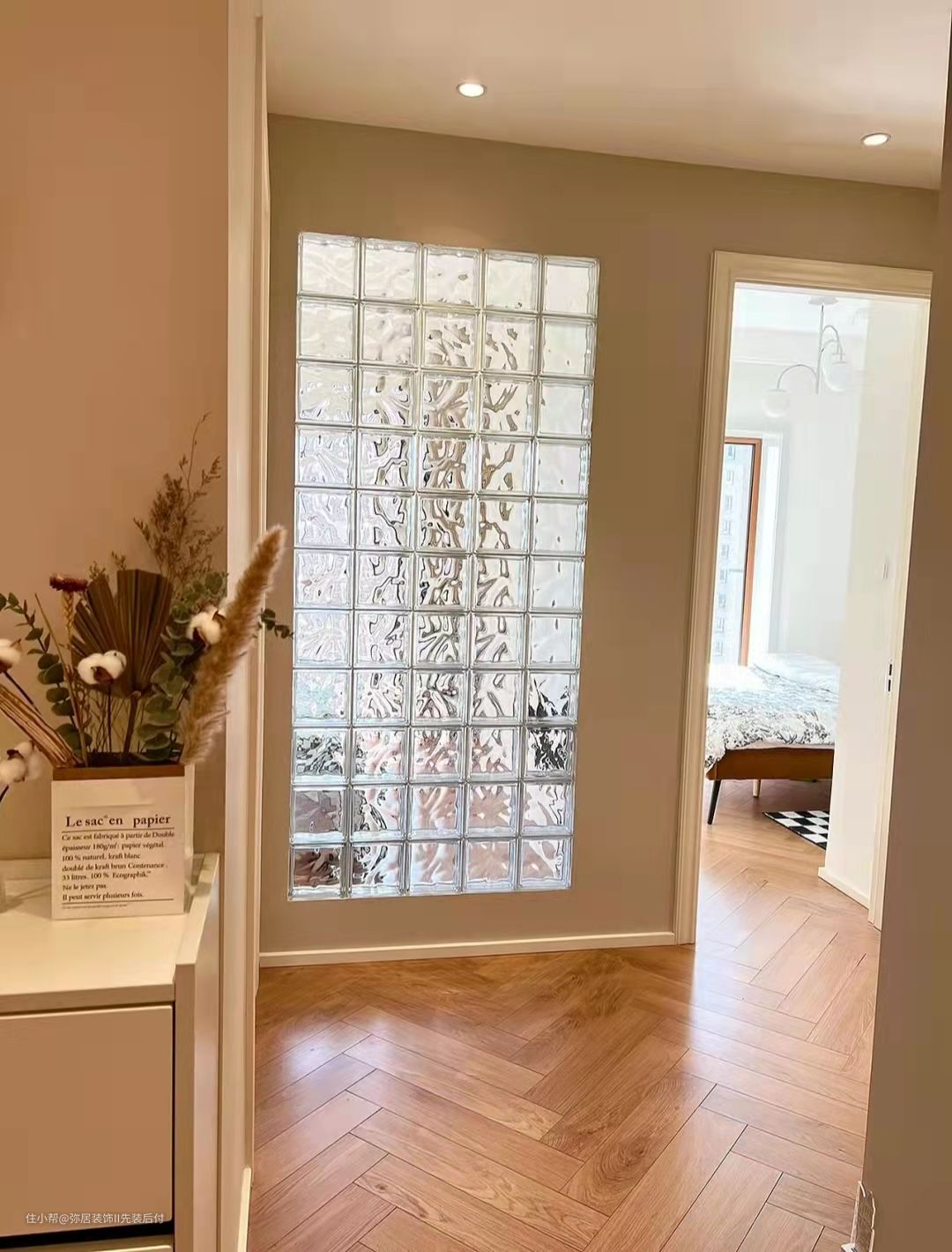 玻璃砖是用透明或者有色的玻璃溶液倒入模具初步冷固成型,再倒入水中冷却进而打磨的一种玻璃制品,透光性良好,可以在表面做不同处理,使砖体表面呈现出磨砂、压花等质感