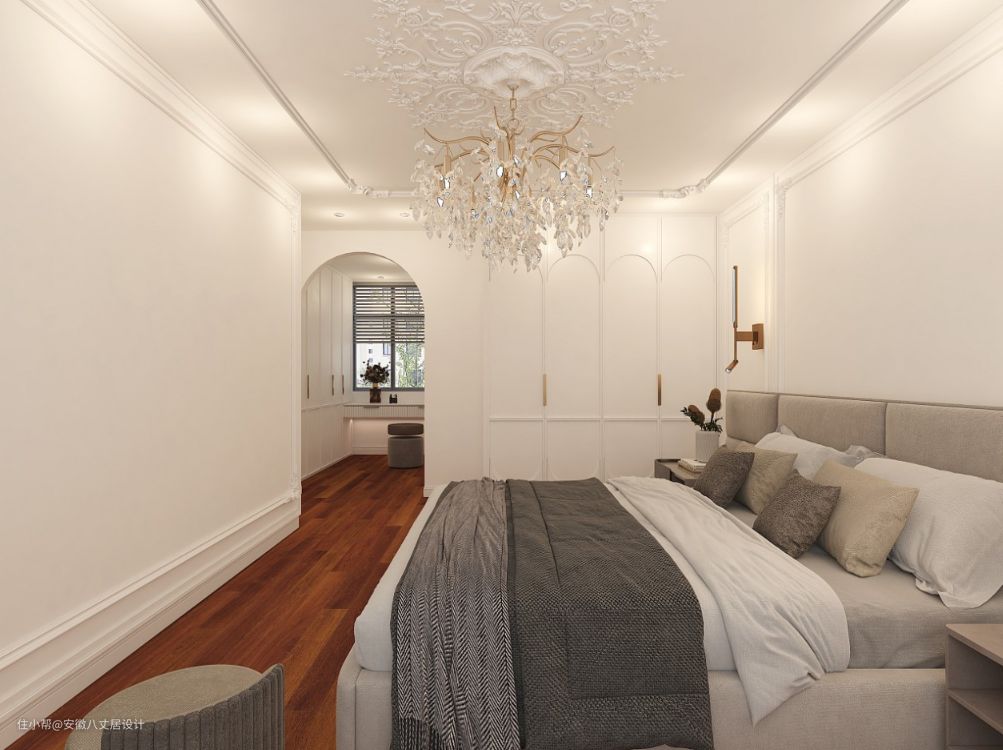 主卧的落地衣柜是一个十分亮眼的存在,做了一个简约的石膏线一般走线装饰,与背景墙的石膏线装饰完美搭配,整合空间融合得十分统一。