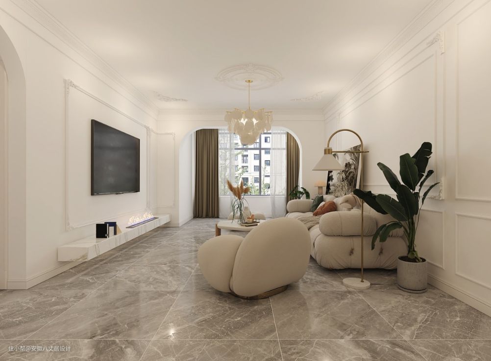 电视背景墙也只是刷了大白墙,但是稍微做了一个细节,石膏线装饰,看起来法式感十足,耐看还不单调。沙发边的落地灯让整个居室的灯光氛围感十足,暖暖的很温馨。