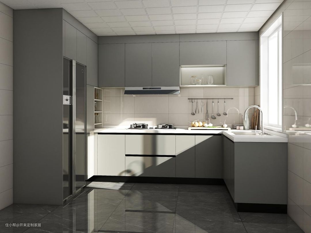 U型设计:嵌入冰箱、开架收纳、挂墙收纳与封闭区比例合理