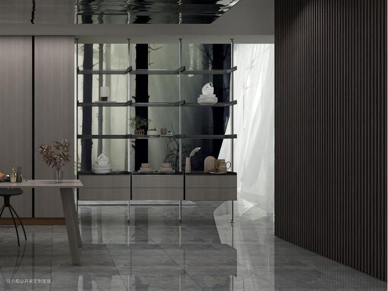 一是设计大面积开架,结合抽屉作为半隔断柜,打造储酒储杯装饰区,玻璃隔板更通透美观,对面入墙式增设常用及备用储物柜;