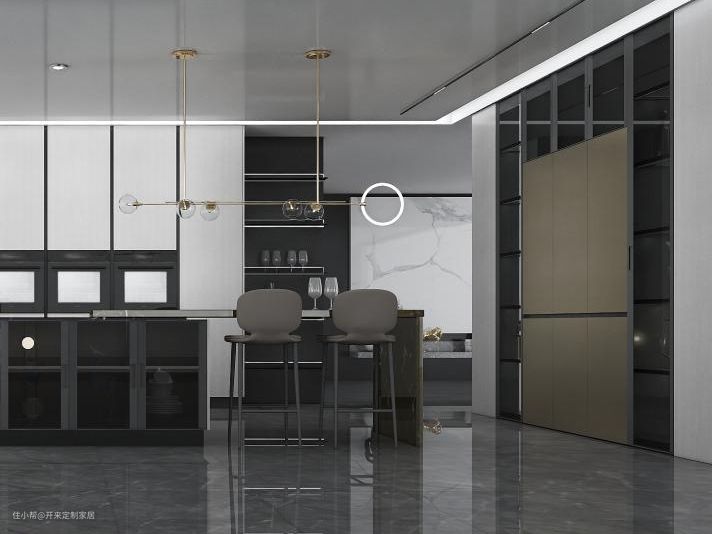 三看岛台一边设计水槽柜,一边玻璃柜延伸餐吧台,收纳餐盘碗碟通透时尚,用餐更高级。