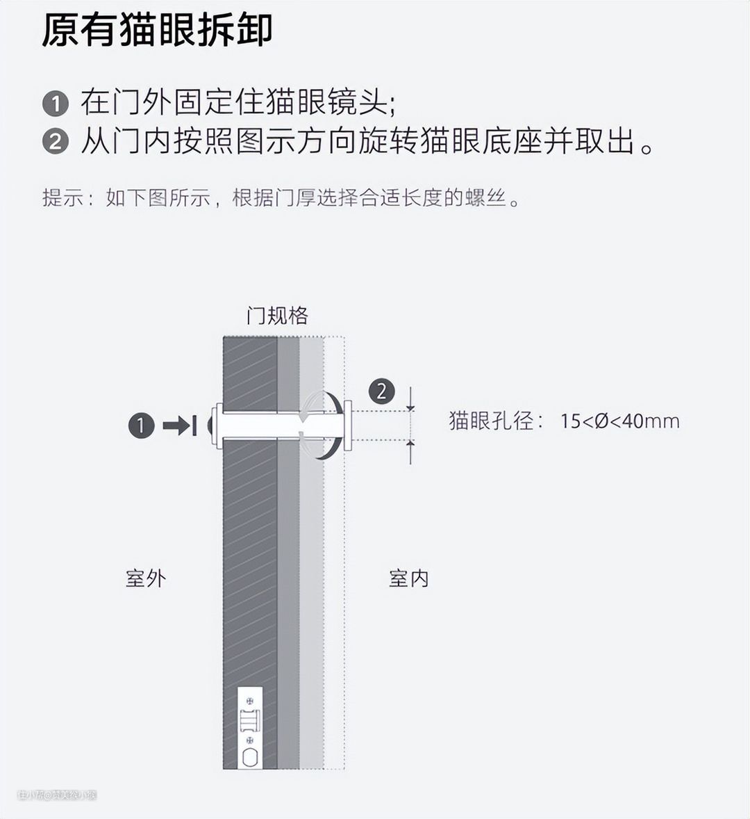 拆除原有物理猫眼前,需要首先将两颗安装螺钉装在猫眼摄像头的背部,选择方法参考说明书根据不同厚度防盗门即可。