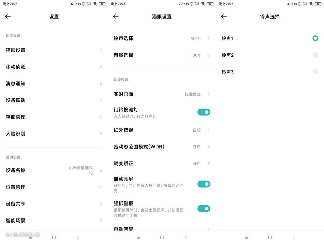 这里首先重点看看猫眼设置,里面包含了常规的门铃铃声选择,铃声音量选择,实时画面清晰度选择,门铃按键灯选择,红外夜视设置,WDR功能设置,畸变校正设置,自动亮屏设置,强拆警报等功能,可以说考虑的是非常周到了,相比一般摄像头来说也毫不逊色。