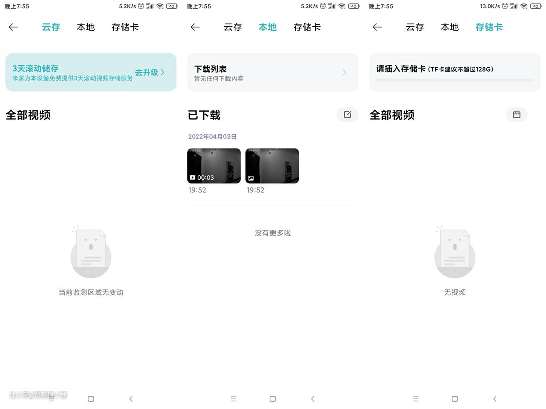 另外,这款小米智能猫眼1S在存储空间上分别支持三种存储方式,分别是云存储,本地存储,本地存储卡。其中云存储可以免费享受3天内滚动存储服务,本地存储则可以在查看时下载到手机端进行存储,存储卡则可以通过插入的TF存储卡进行扩展存储空间,最大支持128G存储卡规格。