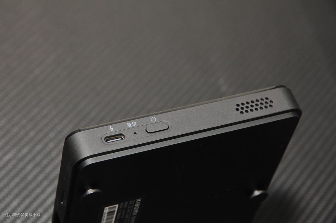 在显示屏侧面则配置有显示屏开机按键与充电接口,以及复位孔。同时还可以看到顶部带有扬声器的开孔,用于进行视频通话。这里充电接口为TYPE-C型号,与目前大多数手机兼容,同时支持5V2A快充协议。