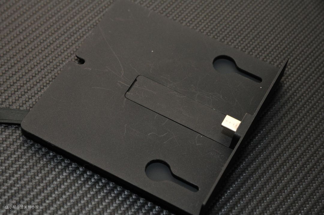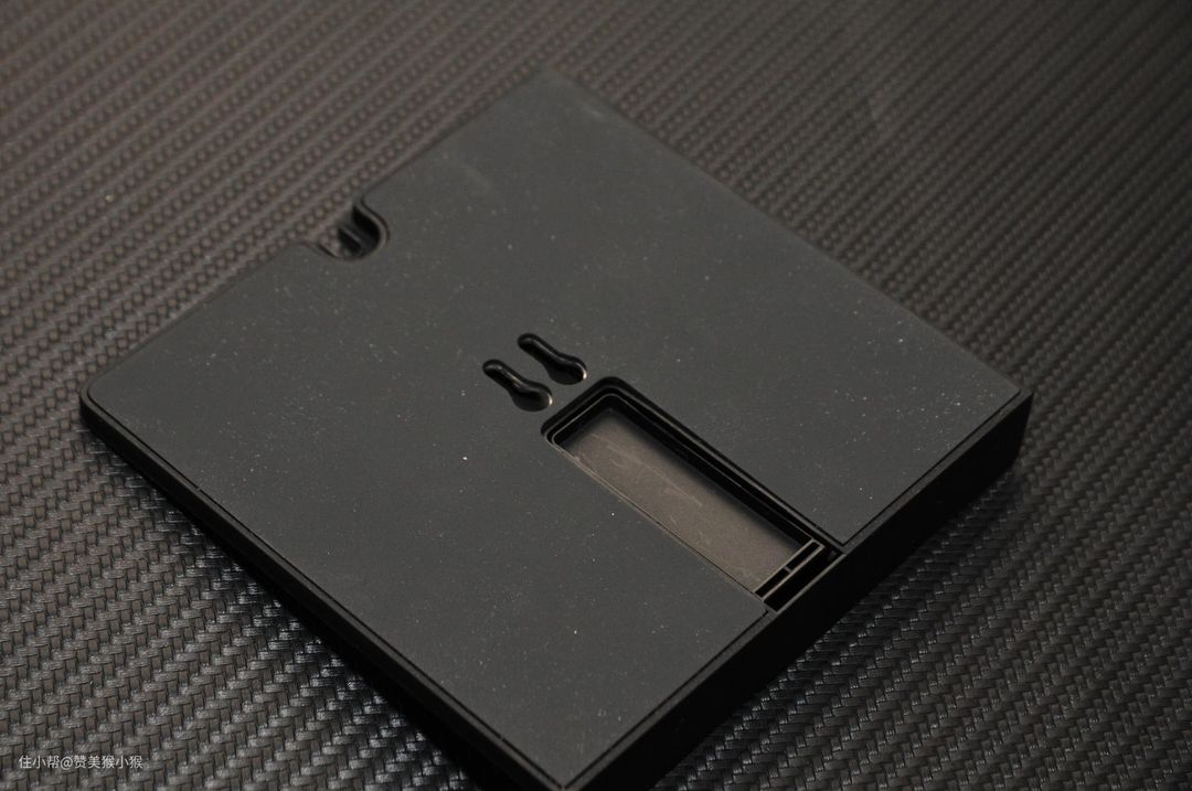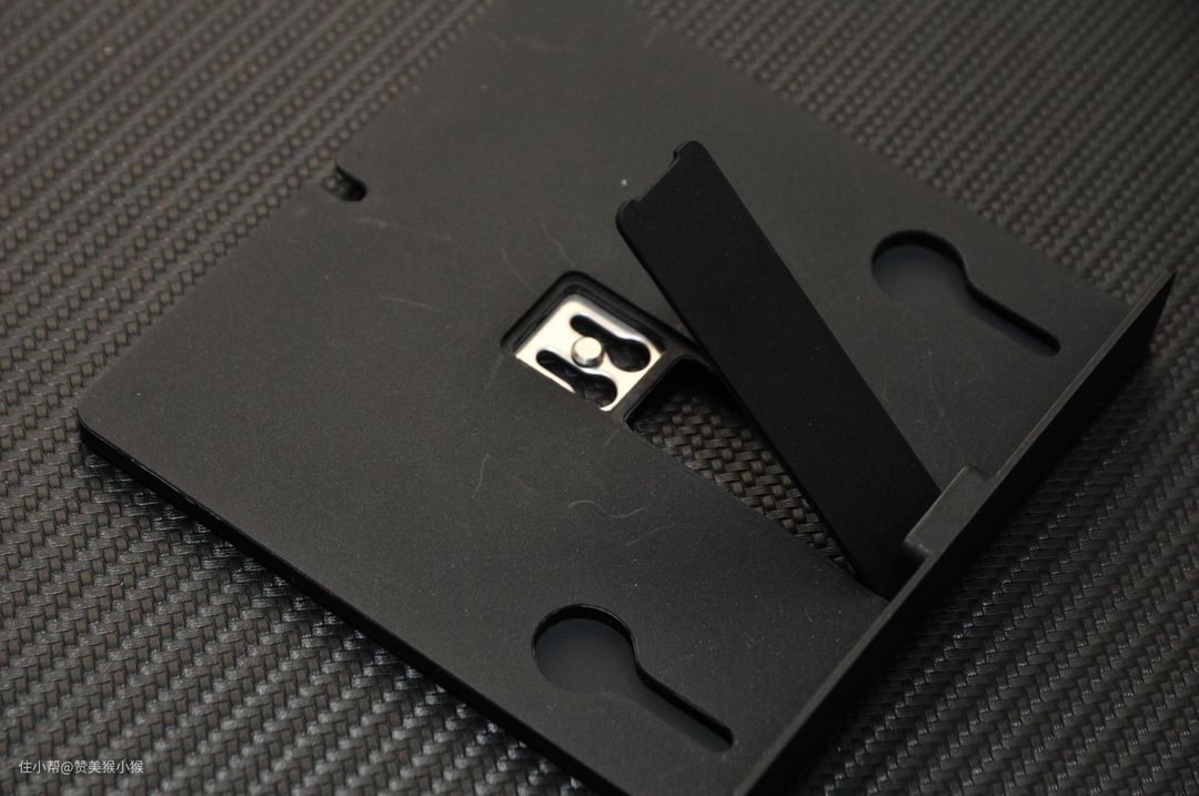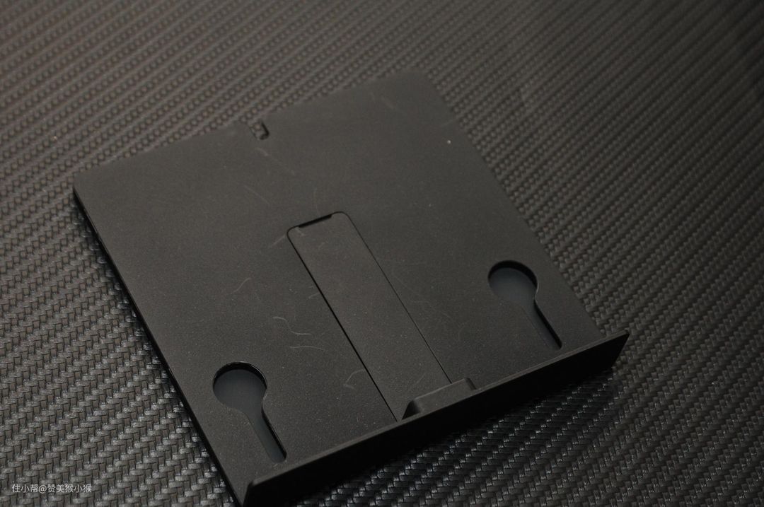 从背面可以看到支架背部同样有两个固定螺钉插槽,用于固定支架与猫眼背部的安装螺钉相连。同时安装支架背部的平面也采用了具有一定摩擦力的磨砂材质用来防止与防盗门之间的滑动摩擦,避免猫眼在开关门时候晃来晃去。