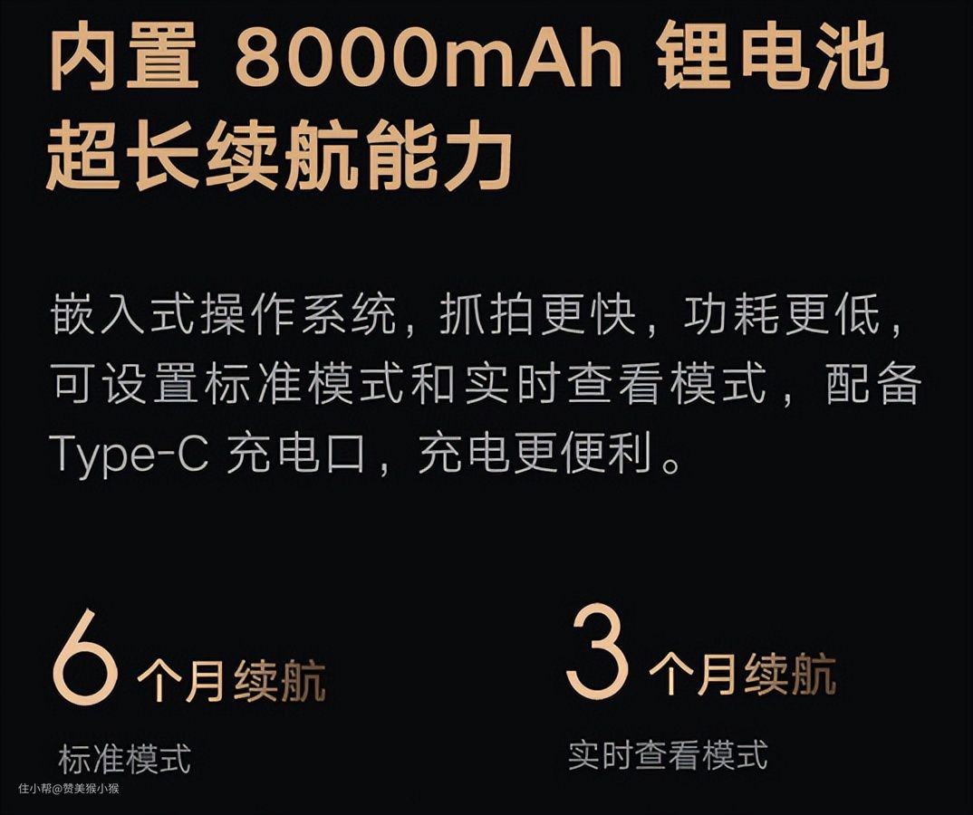 这款智能猫眼具有超广角摄像头,高清夜视与人体侦测功能,不仅可以作为智能猫眼使用,同时也可以兼具摄像头功能,内置有8000mah大容量电池,支持多达3个月续航时间。