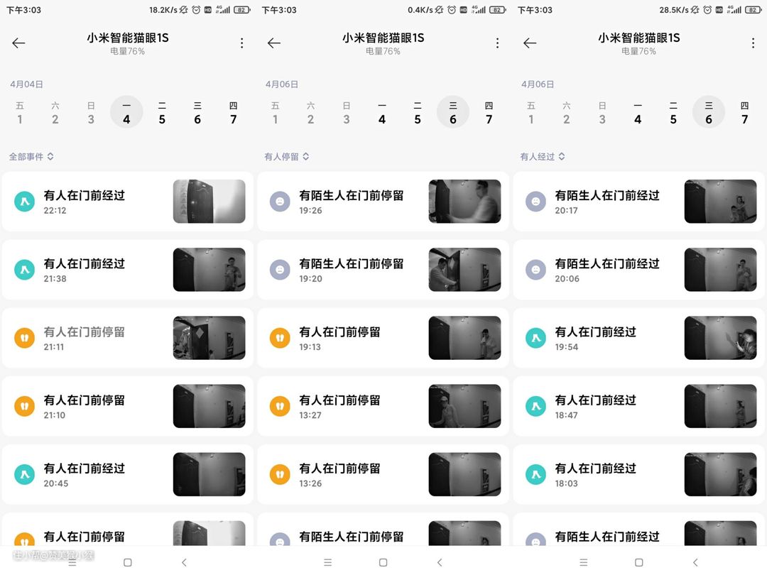 日常对于猫眼的不同视频管理可以分别按照有人经过,有陌生人停留,有人异常逗留等分类进行查看。