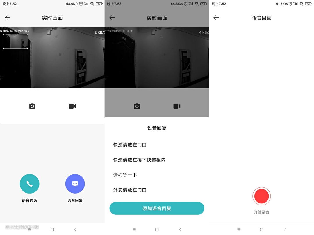 接着实时画面菜单,可以看到在主菜单分为两部分,上部为猫眼监控实时画面,画面下方为截图和录影选项,底部则为实时语音通话和语音回复选项,可以分别进行实时通话或者播放语音进行回复。