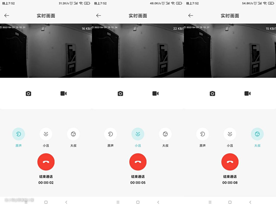 考虑到孩子和老人以及单身女性等人群独自在家的特殊情况,这款猫眼语音通话功能可支持三种变音模式,分别是原声,小丑语音,大叔语音。可以将真实性别进行掩盖。