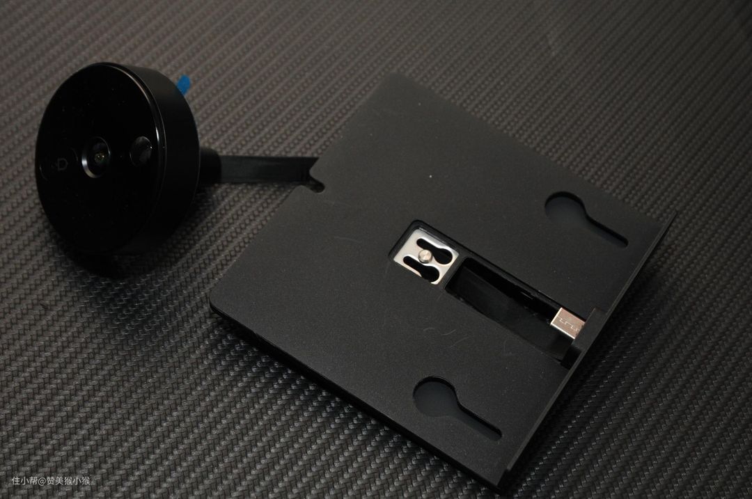 在猫眼摄像头的背部带有两个螺钉安装孔,用于安装连接螺钉,底部的数据线则是连接显示器用来传输数据和供电之用。在猫眼的本体背面带有不干胶用于与防盗门固定,蓝色贴纸部分即为不干胶固定区。
