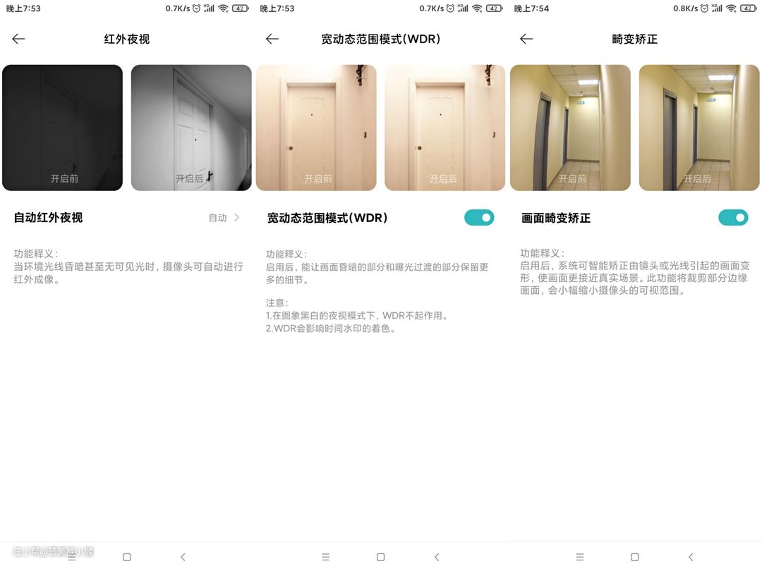 自动红外夜视功能可以提高低照度下的画面清晰度,而WDR功能则可以将暗部的细节显示更加清晰,画面畸变矫正功能则可以将广角镜头的画面失真进行校正,显示画面更加自然。