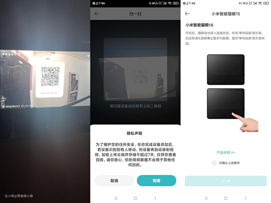 这款小米智能猫眼1S的智能控制对于老米家用户来说上手毫无难度,依然是开机后打开米家APP添加设备即可,注意的是这款智能猫眼需要最新版米家APP应用程序才能添加,老版APP需要提前升级。通过米家APP扫描显示屏开机后的二维码后即可进入添加设备环节。