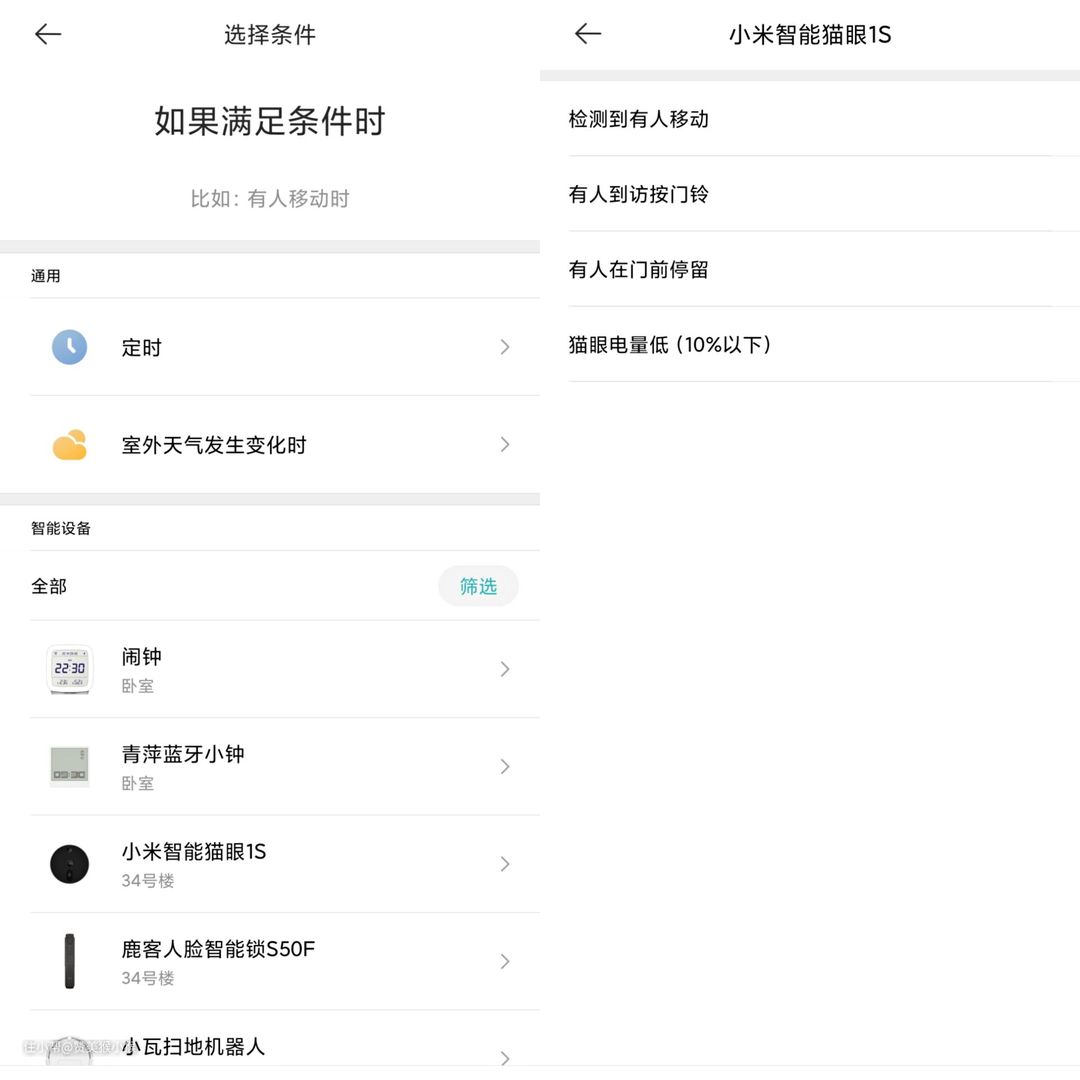 其他联动设置则可以通过常规的条件选择模式进行设置这里小米智能猫眼1S可以提供四种触发条件进行选择,分别是有人移动时,有人按门铃时,有人门前停留时,猫眼电量低于10%时,可以分别选择作为触发条件进行联动。