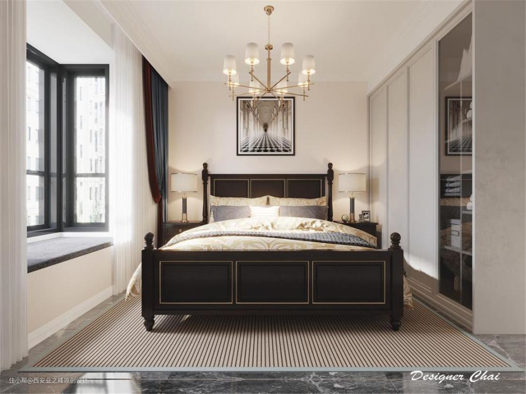 卧室在设计上更重视的是实用与舒适,两个高背的实木床保留了古典的高贵气质,简单的线条和几何图形又给人一种轻盈,精巧的现代感,在软装上我们更多的用少许金属和温馨布艺装点,烘托出简约而典雅的氛围。