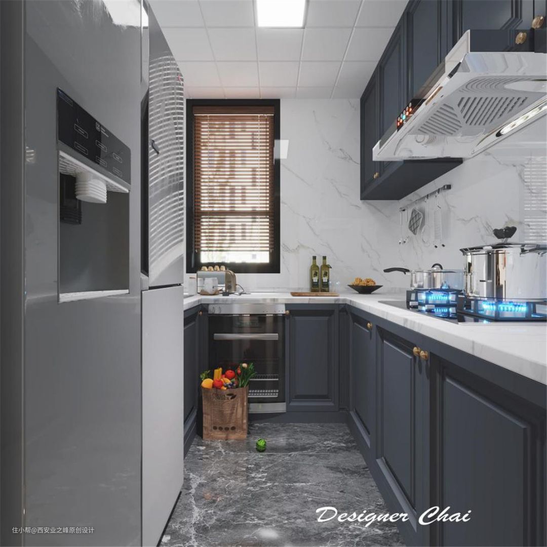 厨房规划为U型,冰箱嵌入式设计释放了上部收纳功能,不浪费一点可用空间。白色墙砖与深色地砖过度,线条干净利落。