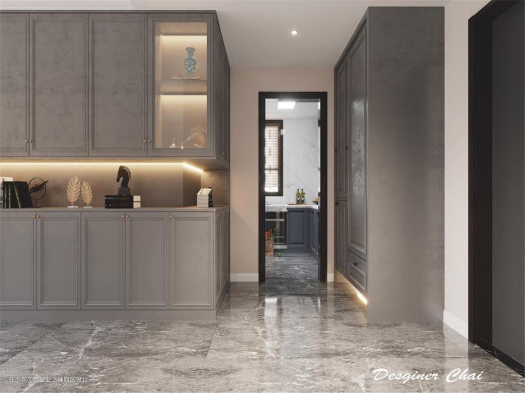 本案依据客户需求和后期居住习惯故将风格定位为美式风格,色调以暖色为主,搭配胡桃色家具,虽不能“谈笑有鸿儒,往来无白丁”,却能以低调的家具配饰和乳白色墙面相应呼出隐于“室”的情怀。房屋结构基本满足业主需求,所以我们从入住者的日常动线思考,进行少量改造,将墙体简单平移,柜体替代墙体,从而达到储物空间满足的情况下不显拥挤,生活动线更清晰便利,提升全无居住舒适感。