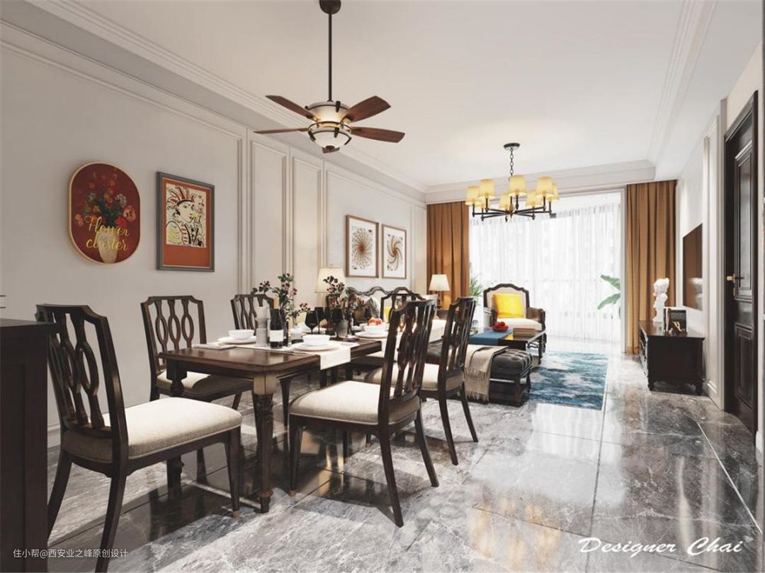 下午茶是女主热爱的美式生活方式之一,餐厅以胡桃木色家具,配合美式吊扇灯体现了舒适优雅的生活趣意。