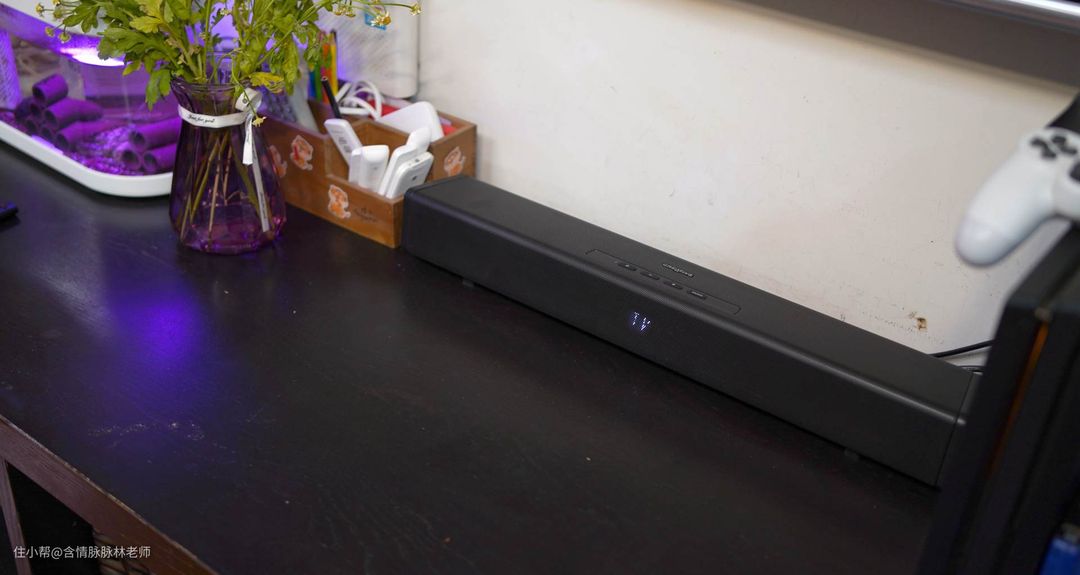 低音炮的放置和主机的位置需要注意,尽量不要把低音炮放在电视柜上,特别是有怕震动的设备,我现在家里的电视柜比较小,暂时放在桌面上使用。等我腾出来在给它换一个合适的位置。