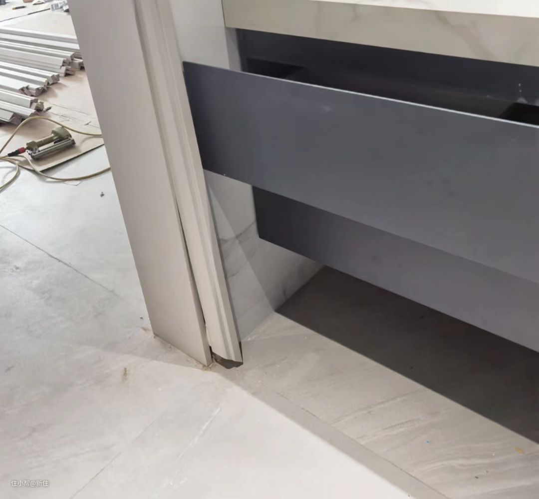 需要注意的是:抽屉式的浴室柜,如果靠门一侧的墙放置一定要考虑:抽屉拉开会不会撞门套?如果可能撞,就让浴室柜厂家缩小柜体,在墙体和柜子中间夹一层板子。
