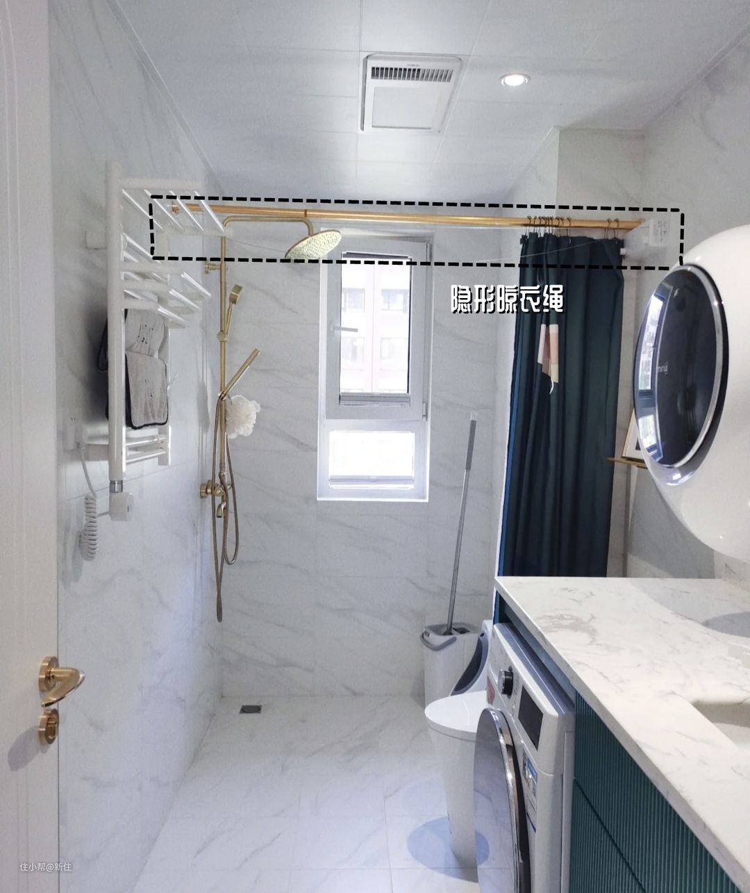 直接借鉴,日本很多公寓的思路,在卫生间内找个不淋水的地方,用上隐形晾衣绳,洗澡时候的衣服能挂,还可以用来晾内衣、袜子等不太适合放在阳台晾的东西。