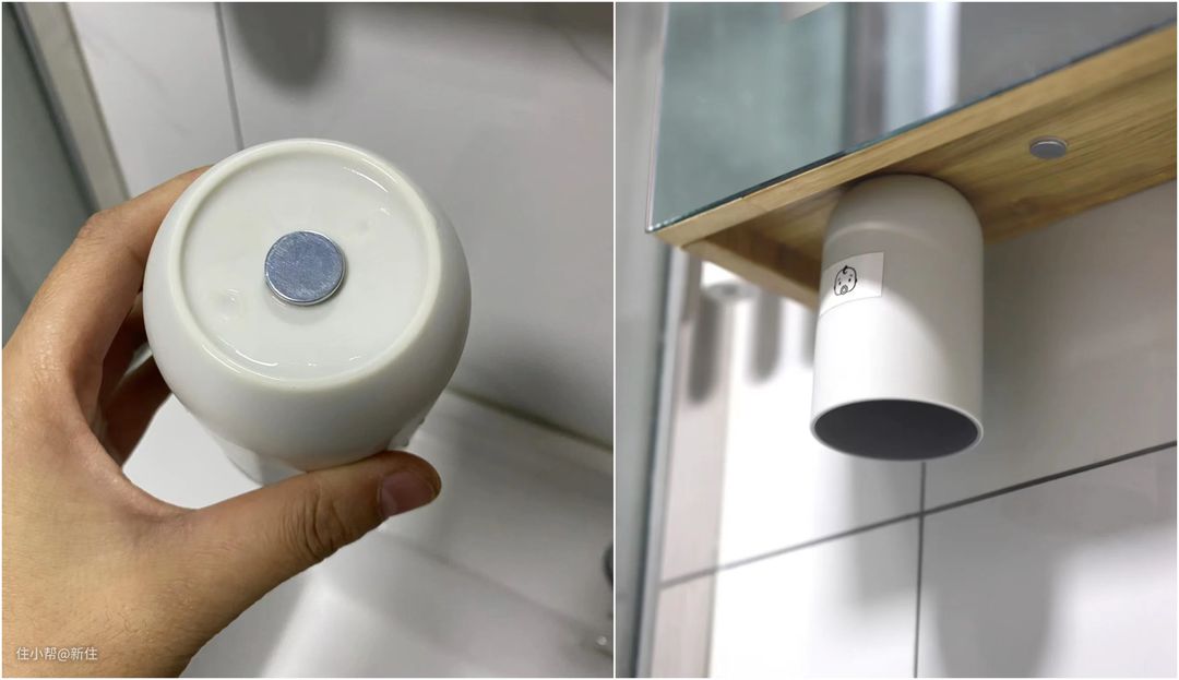 杯子用引磁片+小铁片给挂在镜柜下面,既不显得乱,还拿取超方便。