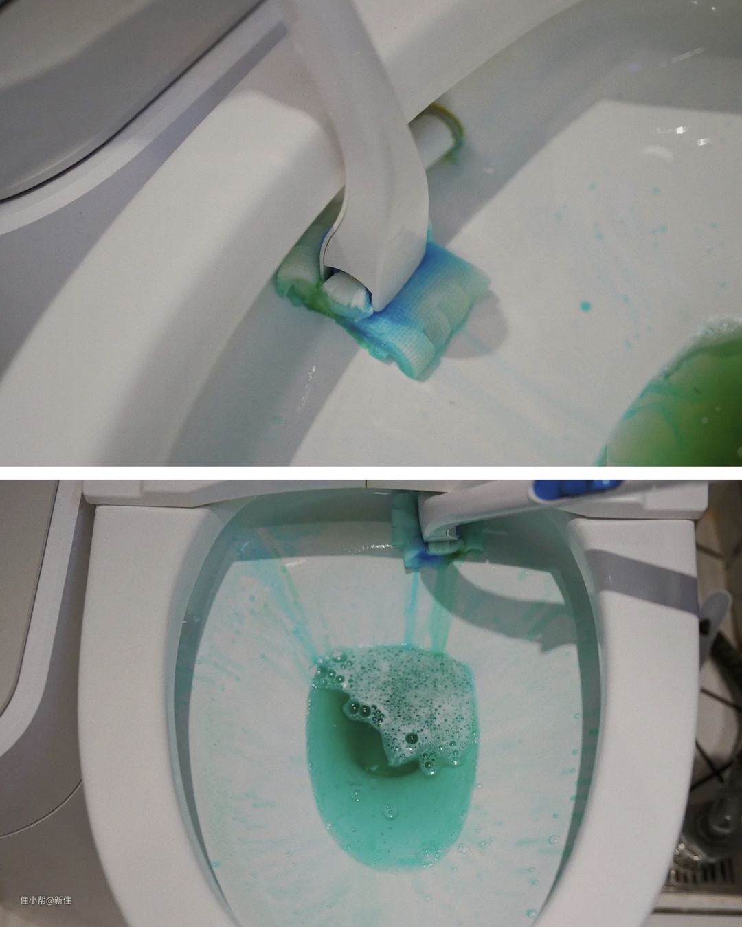 不同于传统马桶刷,一次性马桶刷刷头和刷柄是分离的,刷头自带清洁液,刷的时候,简单方便,连清洁液都不用倒,小小一个刷头,还能深入到边边角角刷得很干净。