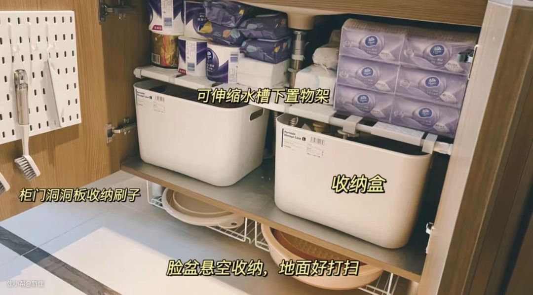 可解决空间浪费的问题,下水管可以直接从伸缩隔板穿过,拿取方便程度不会提升,就给此处放点囤货吧。
