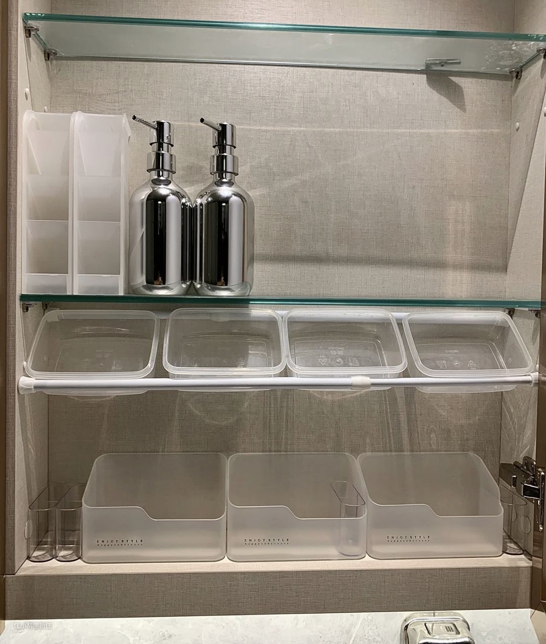 可以测量一下家里的尺寸,可去网上定制一些L型的亚克力板,很便宜,然后再买一些层板托,把亚克力板子托起来,透明的层板,不仅实现镜柜内的扩容,还能让东西更一目了然。