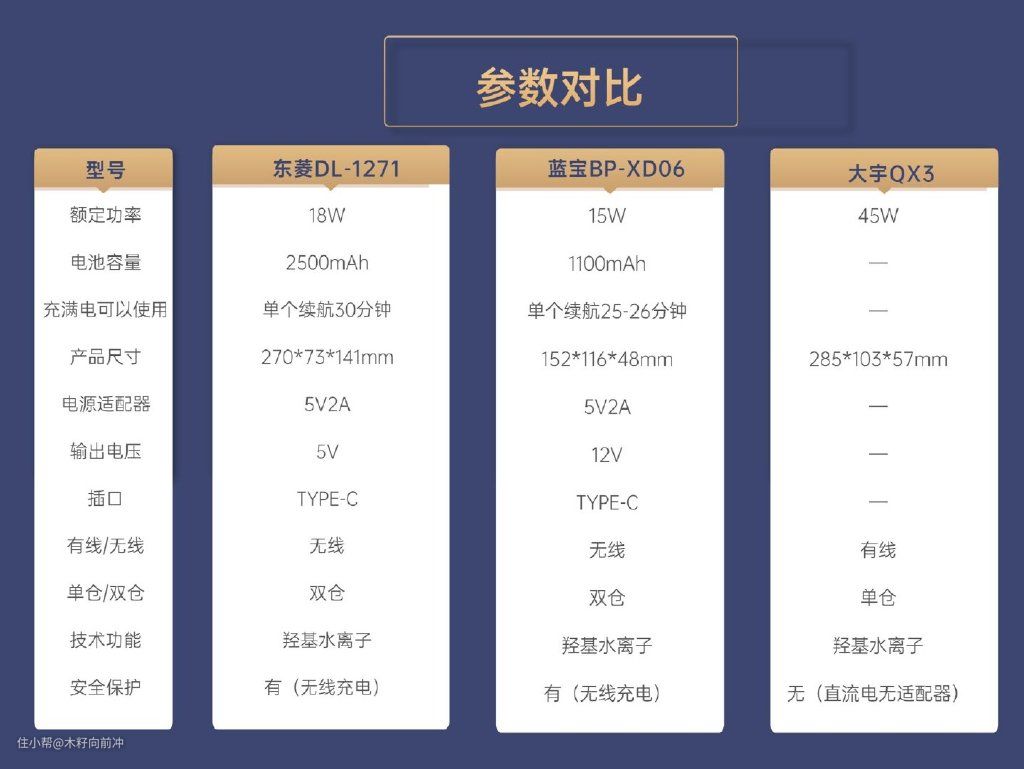 楼主这次选购了市面上比较热门的三款果蔬净化器,分别是东菱DL-1271果蔬净化器、蓝宝BP-XD06果蔬净化器和大宇QX3果蔬净化器。此次对比评测中,楼主将从外形设计、用电安全、功能模式以及实际体验四个方面进行对比。对比之前可以先从参数方面对三款产品有大致的了解。