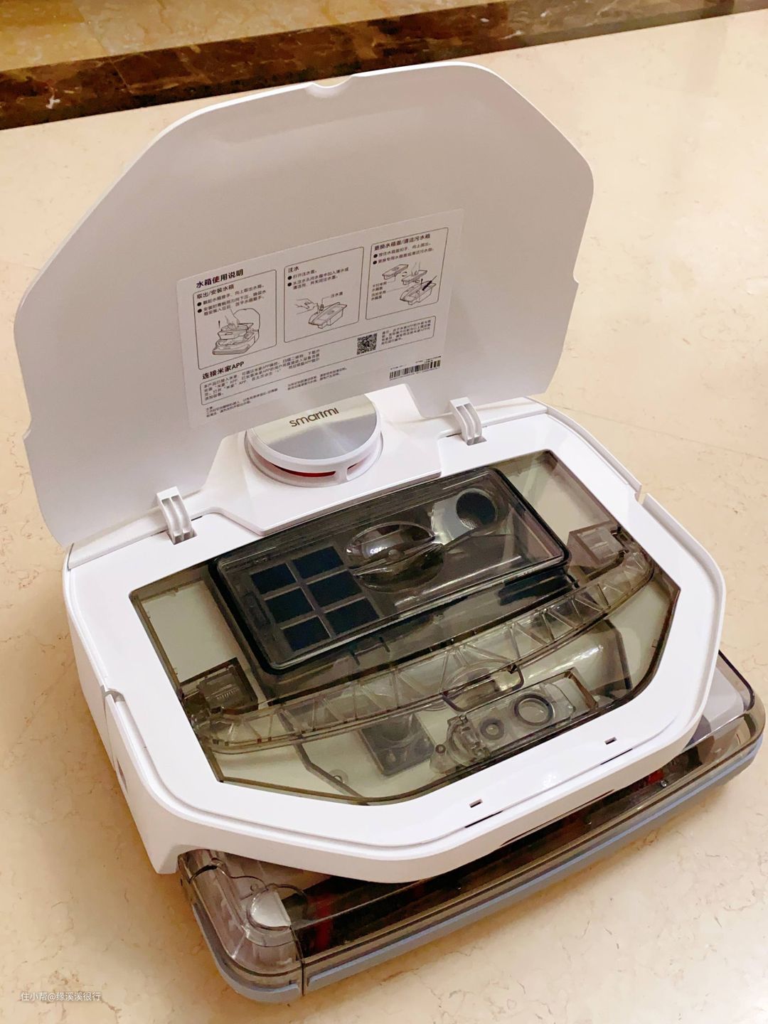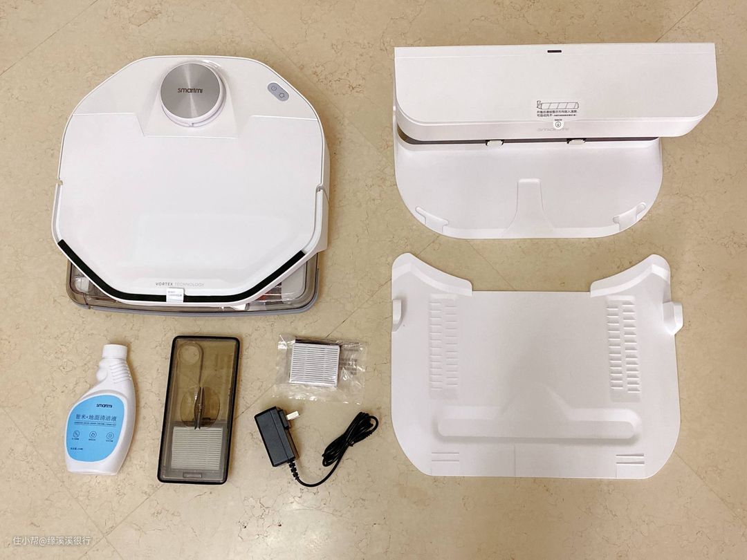 之前家里也有洗地机,不过只是喷水出来,然后一块拖布擦全家,所以脚指头想想也知道除了最初一块地面是干净的以外,其他地位其实不过是把脏污涂抹均匀而已。如果想要保持较为干净的话,那就要频繁地去帮它洗拖布,而有这个功夫,我早用拖把擦干净全家了。 所以这次有了智米洗地机器人,我可要体验一把当“甩手掌柜子”的感觉了。