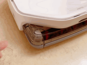 ▲和传统扫地机差不多的是智米的清洁系统是内置的一体式水箱,分为污水和清水箱,翻盖可拎。