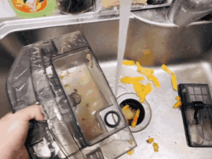 ▲好了,最后我们来看看垃圾的归宿现在怎么样了,都在集尘盒里了,不过很可惜的是,没有做到干湿分离,不过这是洗地机目前的通病,希望下一代产品可以改进。