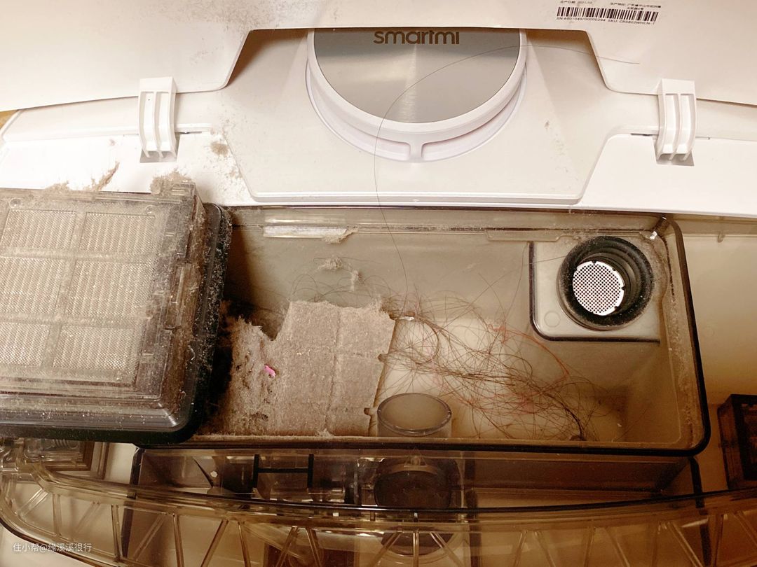 ▲现在看看集尘盒,我家有这么脏嘛?灰尘都结块了啊,我去。不过直接拎出来就倒了,清理了。