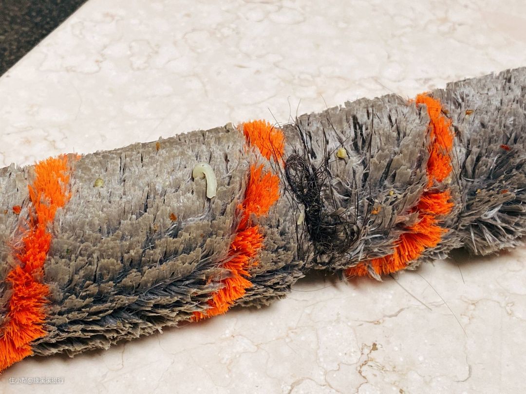 ▲不过还是有点小遗憾,自清洁后的滚刷上还是会有残留物的,这个一定要及时处理掉。另外头发缠绕这个世界难题真是没办法解决啊,不过可以用配套的切刀割开取下来,也算没有办法中的办法吧。