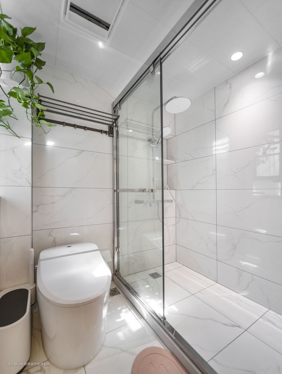 卫生间面积小,选用墙地砖通铺效果,同时以暖色调为主,灯光效果很赞,为满足收纳不足的问题,特意设计了深15宽30高40公分的壁龛做储物装饰一番,颜值也超高的。