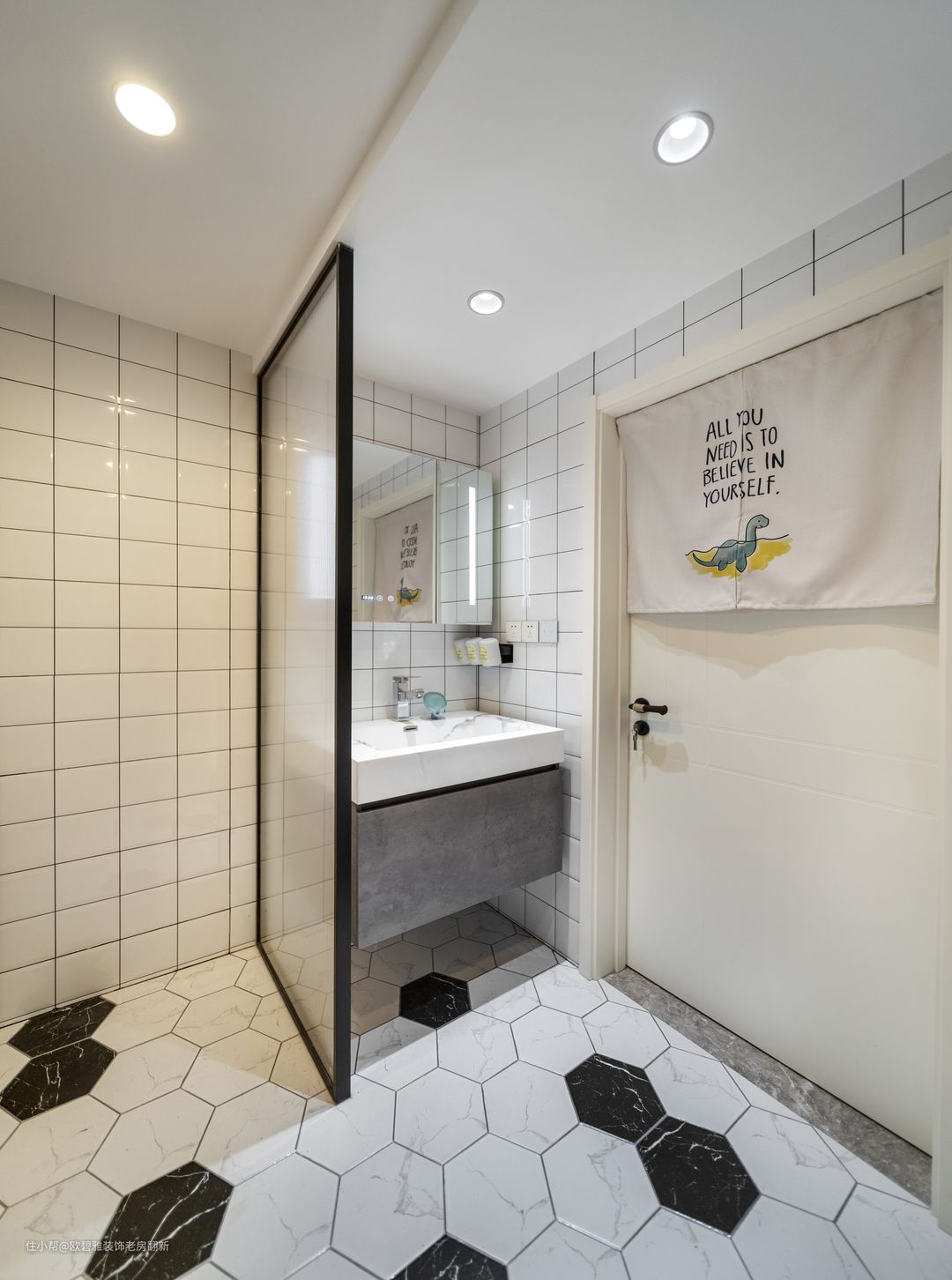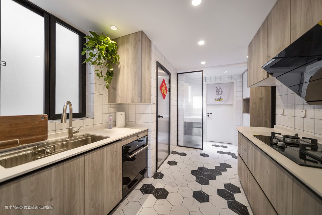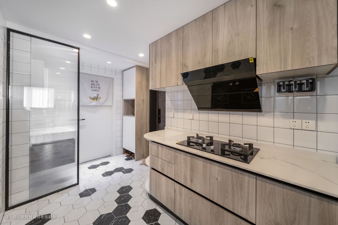 考虑厨房与卫生间干区是重油污和水渍的地方,选用防滑性能较好的六角瓷砖铺贴,黑色与白色的搭配,不仅是一种经典的对比色,还营造无限延伸的空间感,对于小户型的空间来说,再合适不过。